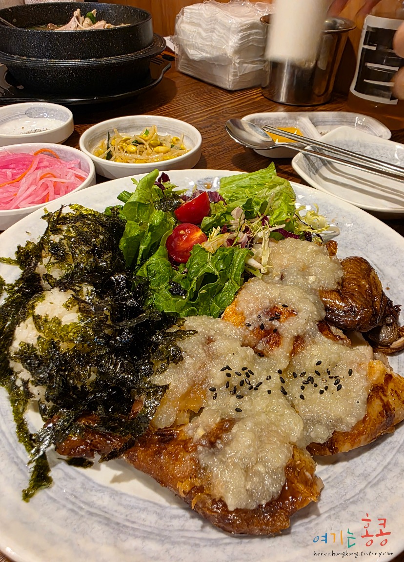 명가 통닭 정식은 간단하게 샐러드, 닭 반마리는 안 되 보이고 주먹밥이 두개 김 가루에 뿌려져 나왔어요. 기름기 쫙 뺐지만 적당히 짭짤한 느낌도 나고 너무 맛있었어요! 맛있어서 그런지 통닭만 조금 더 추가 할 수 있는 옵션이 있으면 좋겠다는 생각을 ㅎㅎ